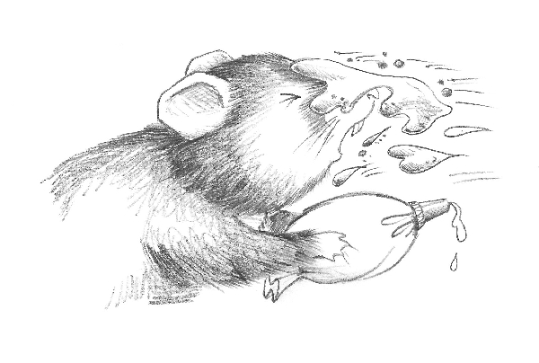 Мышонок вытер розовую глазурь со щёчки и со счастливой улыбкой облизал сладкую лапку. Но тут закричали и все остальные звери, потому что пирожные со столов полетели прямо в них. Плюх, шмякс, блямс!