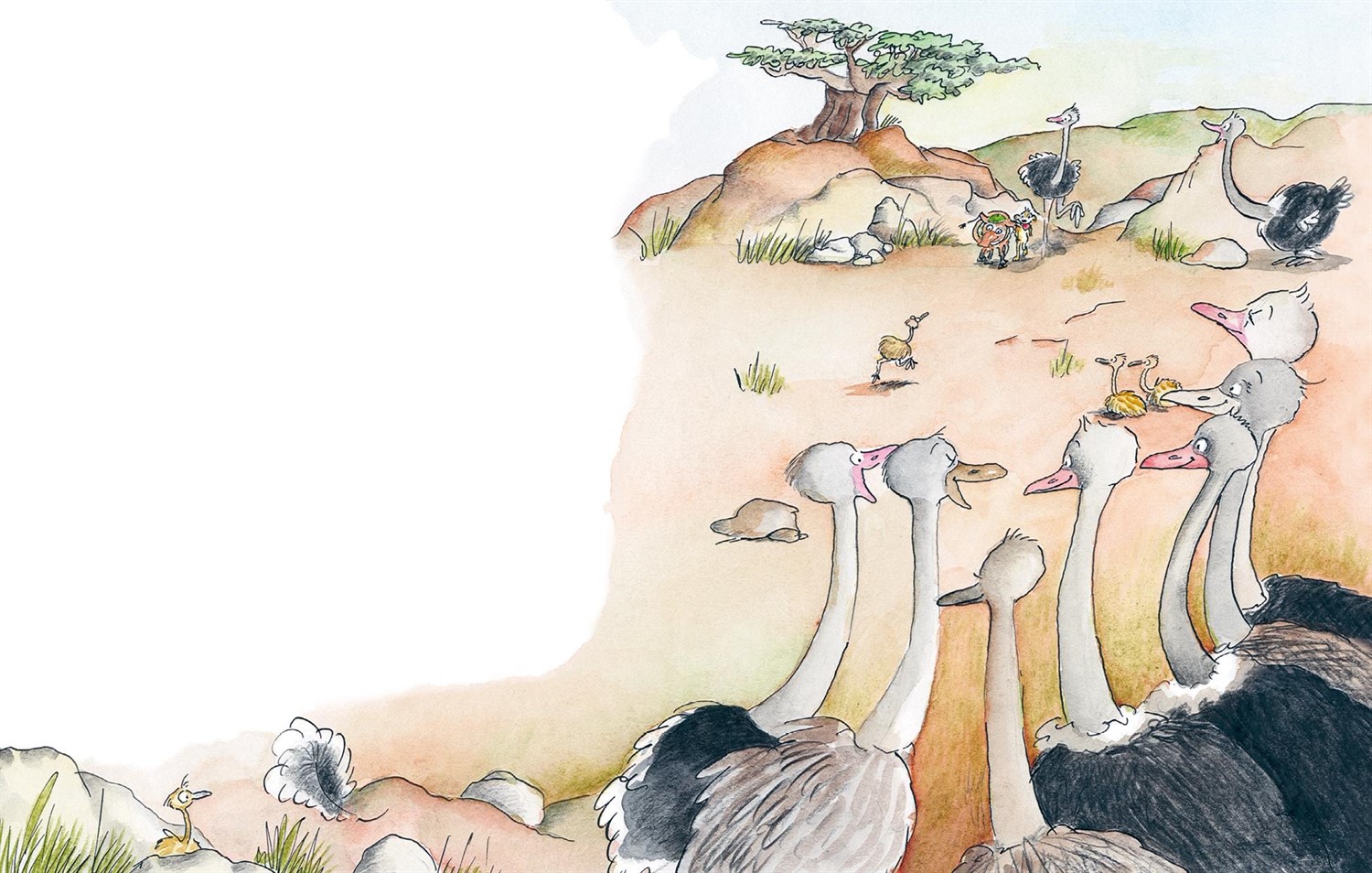 Вокруг небольшой поляны собралось множество страусов. Неожиданно один маленький страусёнок подскочил к Кисточке.