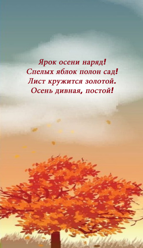Автор: Ольга-Влада СкобелкинаЛежат на дорожках листочки ковром.Уснули чудесным полуденным сном.Вчера ветерок с ними долго играл,Вскружил их отчаянно и убежал!Остался лежать на тропинках узор,А дворник подмёл все газоны и двор.Сердитой метёлкой прогнал этот сон,И к дому тихонько направился он.А днём прикоснулся к листве яркий луч,На небе исчезла гряда тёмных туч.А вместо дождя наступил листопадИ радует золотом парки и сад.Дубовый листочек, а рядышком клён —Резной, как снежинка и радужный он.На ветке с рябинкой рубиновый лист.В беретике жёлудь забавен и чист.Осиновый листик округлый, резной.Цвет листьев берёзы совсем золотой.Ольховый шершавый, складной, как гармонь.У тополя листик широк, как ладонь.Мы в солнечный тёплый свободный денёкЛисточки пойдём собирать в кузовок.И дома поставим осенний букет,Украсит он в кухне бабулин буфет.Замечательный совет