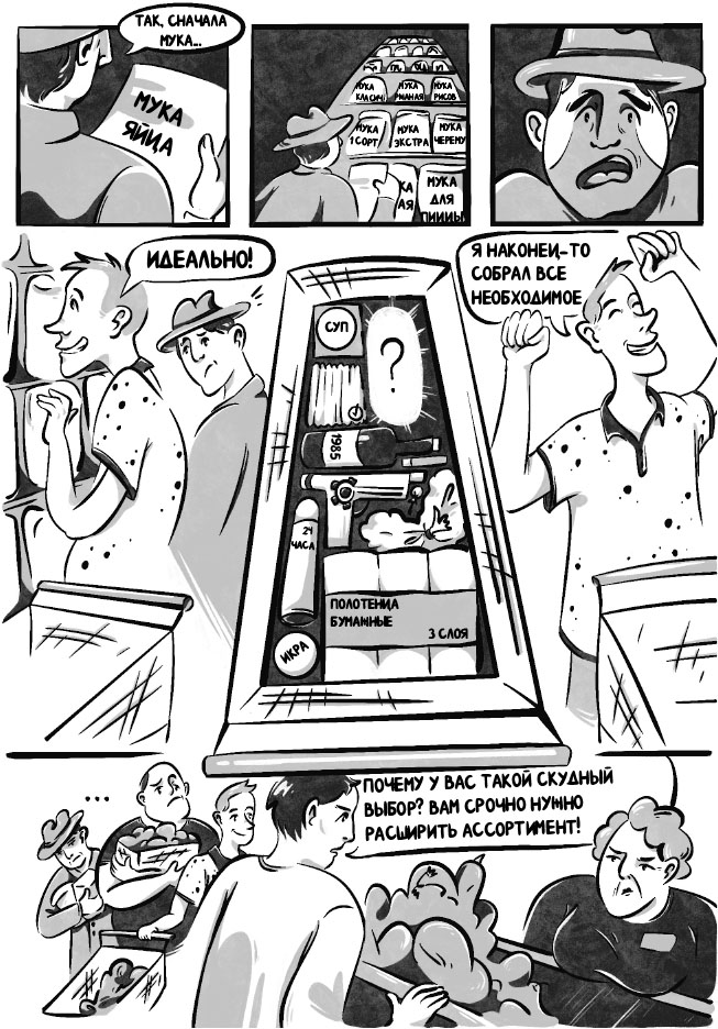 Как я уже упоминал, мы поговорим о перегруженности выбором и ее влиянии на целый ряд областей человеческой жизни, зачастую очень важных. Но для понимания смысла слова «перегруженность», вкладываемого мной, приступим к теме с самого низа иерархии потребностей и постепенно поднимемся. А для этого еще раз отправимся за покупками.