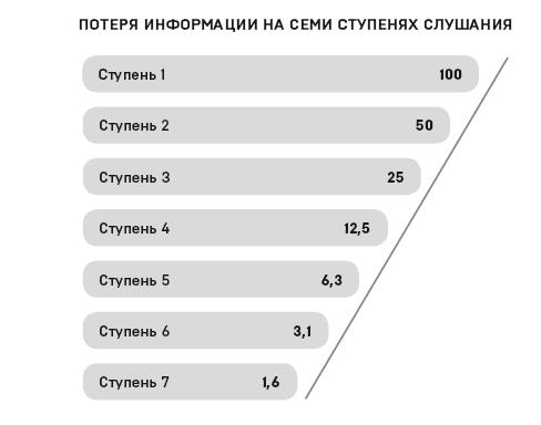 Кроме того, становится очевидным, что, если руководитель желает получить значимую информацию, ему придется найти ее «источник», то есть спуститься на первую или вторую ступень и задать уточняющие вопросы, а не просто оставаться на «верхних этажах», занимаясь глобальными вопросами развития компании. Кто может принять взвешенное решение, владея лишь 1,6 % информации?! Из этого следует девиз: умение говорить – серебро, умение слушать – золото!