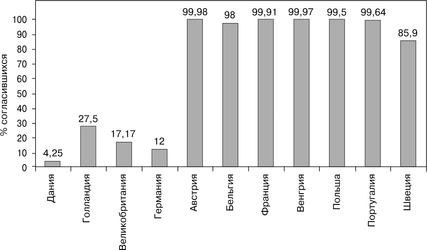 Перед вами график согласия стать донором органов в разных странах Европы. Вопрос: почему в Великобритании, Германии лишь 15 % населения готовы пожертвовать свои органы для пересадки, в то время как среди жителей Бельгии, Франции, Португалии этот показатель достигает 100 %?
