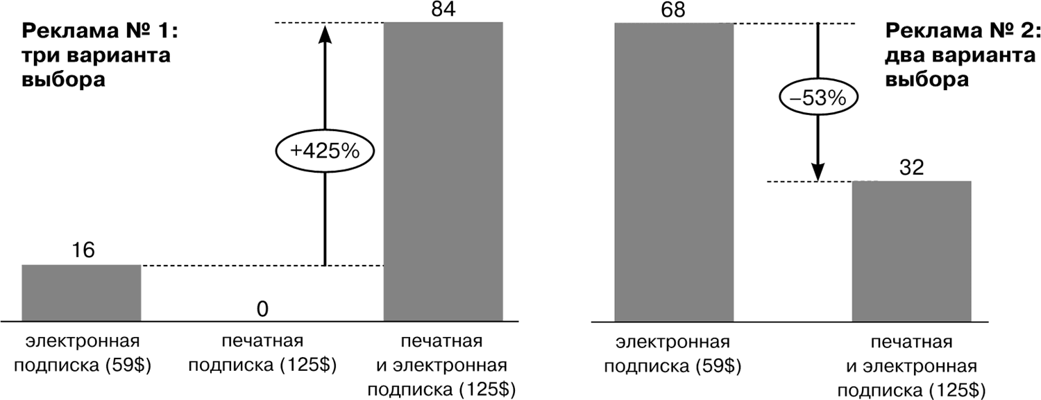 Даже заведомо бессмысленные варианты способны подтолкнуть потребителя в сторону «правильного» выбора. Профессор MIT Дэн Ариэли провел эксперимент с рекламным объявлением журнала The Economist. Редакция предлагала три варианта оформления подписки: электронную за 59 долларов, печатную – за 125 долларов или и печатную и электронную за те же 125 долларов. Наличие второго варианта выглядит дико – естественно предположить, что люди предпочтут взять за ту же цену сразу два продукта. И действительно, этот вариант не выбрал никто, большинство предпочло купить два вида подписки.