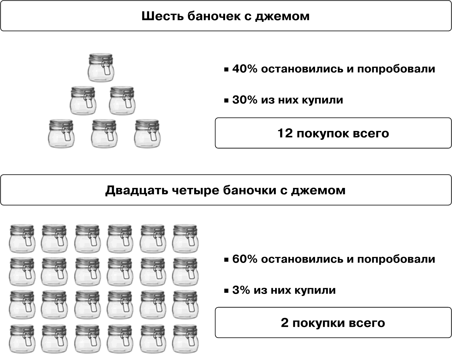 Шина Айенгар и Марк Леппер провели эксперимент с выбором «лишних» вариантов в реальных условиях. Покупателям предлагали выбрать и приобрести баночку джема. В первом случае на подносе было 6 баночек, во втором – 24. Большее количество баночек привлекало больше внимания. Но количество покупок было в разы выше в ситуации с меньшим выбором.
