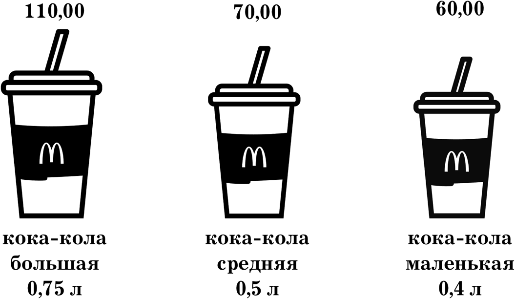 Человеку сложно точно сформулировать свои желания – да откуда я знаю, сколько миллилитров воды я хочу выпить? Я просто хочу пить. Поэтому за нас уже подумали. Смотрим на терминал самообслуживания Макдоналдса. В меню можно выбрать четыре варианта колы: маленькая (250 мл), стандартная (400 мл), средняя (500 мл) и большая (750 мл).