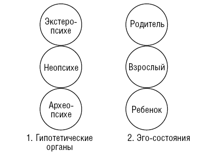 Это значит, что можно наблюдать, как пациенты переходят из одного состояния сознания с соответствующим ему паттерном поведения в другое. Одно эго-состояние характеризуется адекватным восприятием реальности и способностью к логическому мышлению (вторичный процесс), другое – аутистическим мышлением и архаическими страхами и ожиданиями (первичный процесс). Первое свойственно взрослому человеку, знакомому со словом «ответственность», тогда как второе больше подходит ребенку, чье мировосприятие значительно отличается от мировосприятия взрослого. Это позволяет предположить о существовании двух психических органов – неопсихе и археопсихе. Проявления этих органов во внешнем мире, доступные наблюдению, мы назовем Взрослым и Ребенком соответственно. Такое название кажется вполне адекватным; к тому же ни у кого из пациентов оно не вызвало отторжения.
