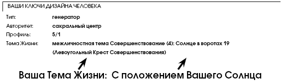 Под Картой перечислены ваши Тип, Авторитет, Профиль и Тема Жизни. Как уже говорилось выше, в книге «Дизайн Человека. Откройте человека, которым вы были рождены» подробно описаны Тип, Авторитет и Профиль, а также другие элементы. Эта же Книга посвящена Теме Жизни. В названии Темы Жизни содержатся указание подраздела (Личная, Фиксированная, Межличностная), цифра, означающая Четверть Солнца (в круглых скобках), номер ворот и описание в зависимости от положения Солнца.