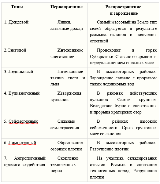 На основе главных факторов возникновения сели классифицируются следующим образом: зонального проявления – главным фактором формирования являются климатические условия (осадки). Носят они зональный характер. Сход происходит систематически. Пути движения относительно постоянны; регионального проявления (главный фактор формирования – геологические процессы). Сход происходит эпизодически, и пути движения непостоянны; антропогенные – это результат хозяйственной деятельности человека. Происходят там, где наибольшая нагрузка на горный ландшафт. Образуются новые селевые бассейны. Сход – эпизодический.