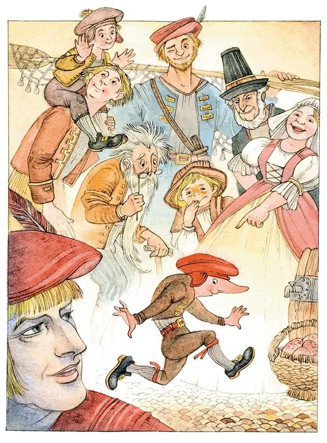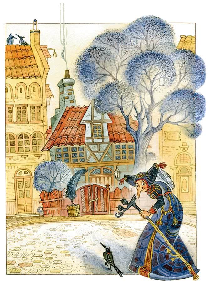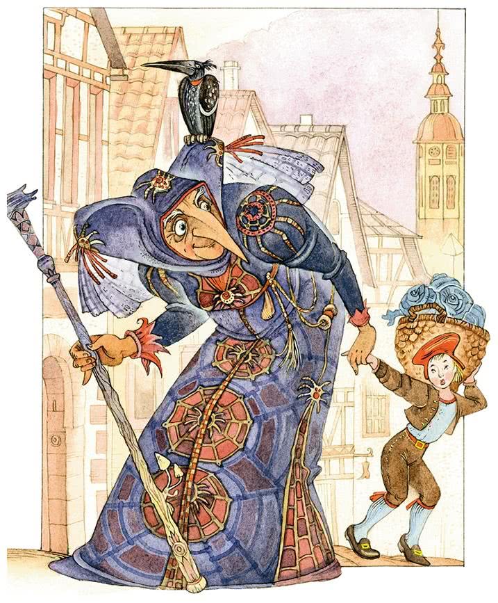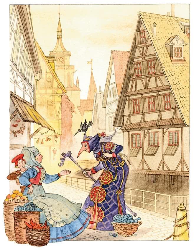 Как раз в это время на рынке показалась какая-то странная старуха: платье на ней было оборвано, лицо острое, сморщенное, с красными глазами и длинным крючковатым носом. Она шла, опираясь на высокую палку, но всё-таки хромала, шаталась из стороны в сторону, как будто на ногах у неё были колёса, и того и гляди она могла шлёпнуться острым носом на мостовую.