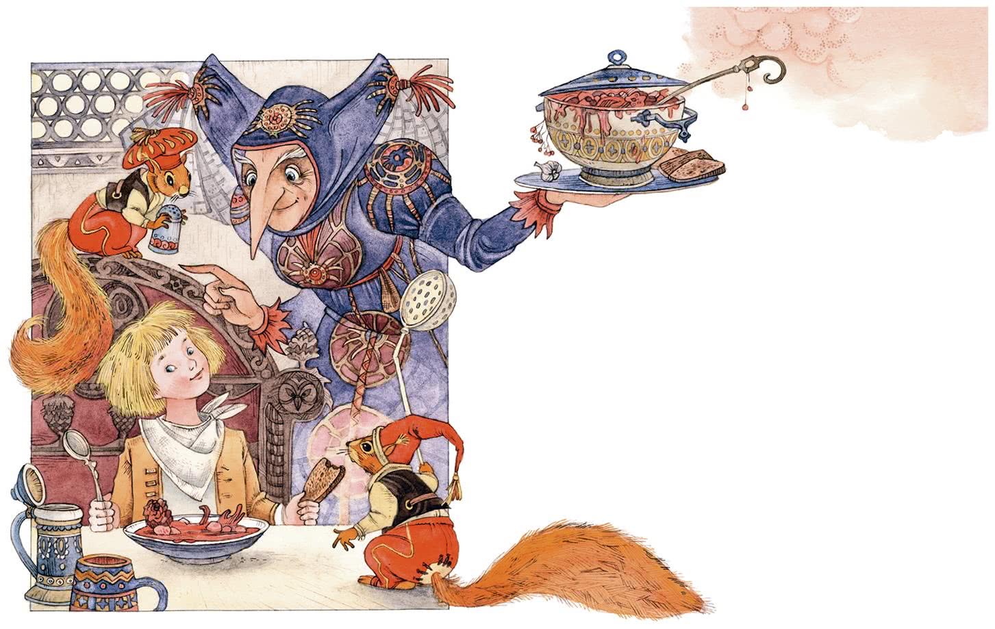 Тут она снова засвистела. Сначала появилось несколько морских свинок в передниках; за поясом у них торчали кухонные ложки и поварские ножи. За ними вприпрыжку прибежали белки в широких турецких шароварах[1] и зелёных бархатных шапочках. Они, по-видимому, были поварятами. Проворно лазили они на стены, доставали с них горшки и блюда, приносили яйца и масло, коренья и муку и всё это ставили на плиту. Старуха же в своих кокосовых скорлупках бегала по комнате, и мальчик видел, что она старается сварить ему что-то очень вкусное. Вот затрещал огонь, в горшке закипело, и приятный аромат разлился по комнате. Но старуха продолжала бегать туда и сюда, и каждый раз, проходя мимо плиты, совала свой длинный нос в горшок. Наконец кушанье закипело, пар густыми клубами повалил из горшка, и пена полилась на огонь.