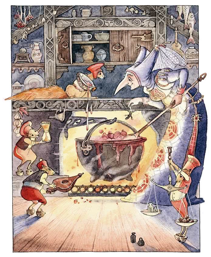 – Вот тебе, сыночек! – сказала она. – Покушай этого супа, тогда у тебя будет всё то, что тебе так понравилось у меня. Будешь и ты искусным поваром, но корешка – корешка-то не найдёшь, потому что его не оказалось в корзине твоей матери!