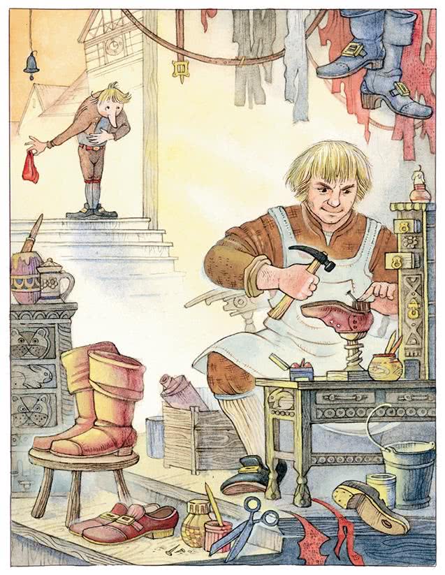 В одном большом городе моего любезного отечества – Германии – много лет тому назад жил сапожник со своей женой. Муж обыкновенно сидел в лавке на углу улицы и чинил башмаки. Случалось ему иногда шить и новую обувь, если находились заказчики, но для этого ему каждый раз приходилось покупать кожу, так как он по бедности не имел запасов. Жена торговала овощами и фруктами, которые разводила в небольшом садике, и многие охотно покупали у неё, так как она всегда была опрятно одета и умела красиво раскладывать свой товар.