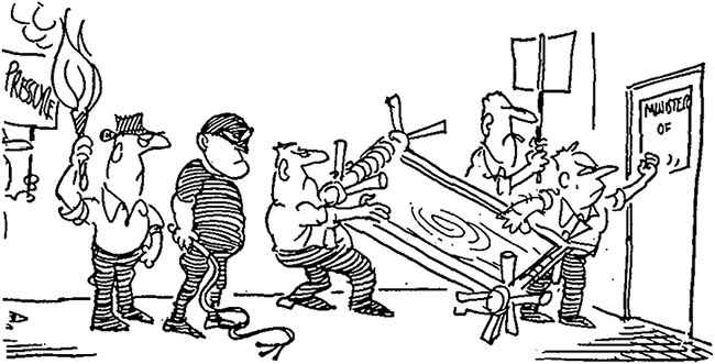 When not fighting, pressure groups can form coalitions. ‘Our members not getting a fair crack of the whip,’ say NZ Sadists’ Society and NZ Masochists’ Association in a joint demand for increased import quotas for instant whip. Most important of all, pressure groups have to cajole ministers. All have equal rights to earbash members of Cabinet. The Government, for its part, is anxious to co-operate. To go against any pressure group is to court a storm of protest and unpopularity. Ministers have therefore attempted the taming of the shrewd by keeping all the groups happy. Faced with problems, overseas governments take decisions. The New Zealand rulers call a conference of pressure groups: