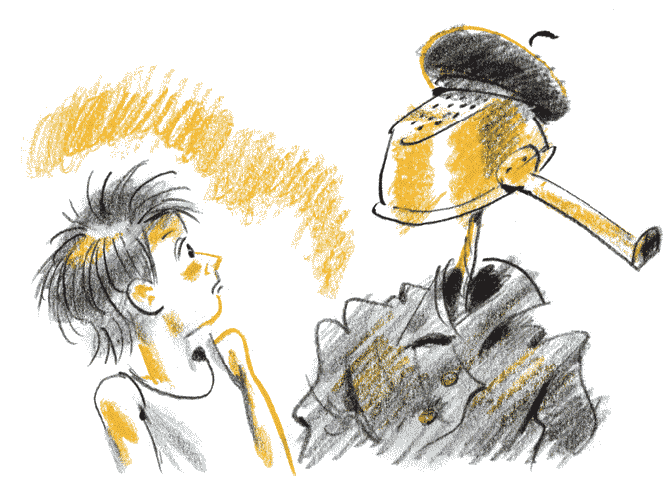 Но халат оставался неподвижным, и Мишка решился приблизиться. Огородное пугало стояло около клубничной грядки, облаченное в темно-синий рваный халат и берет. Вместо лица висел дуршлаг с кусочками фольги по краям. Они чуть колыхались, хотя ветер из степи сюда через крепкий забор не проникал.