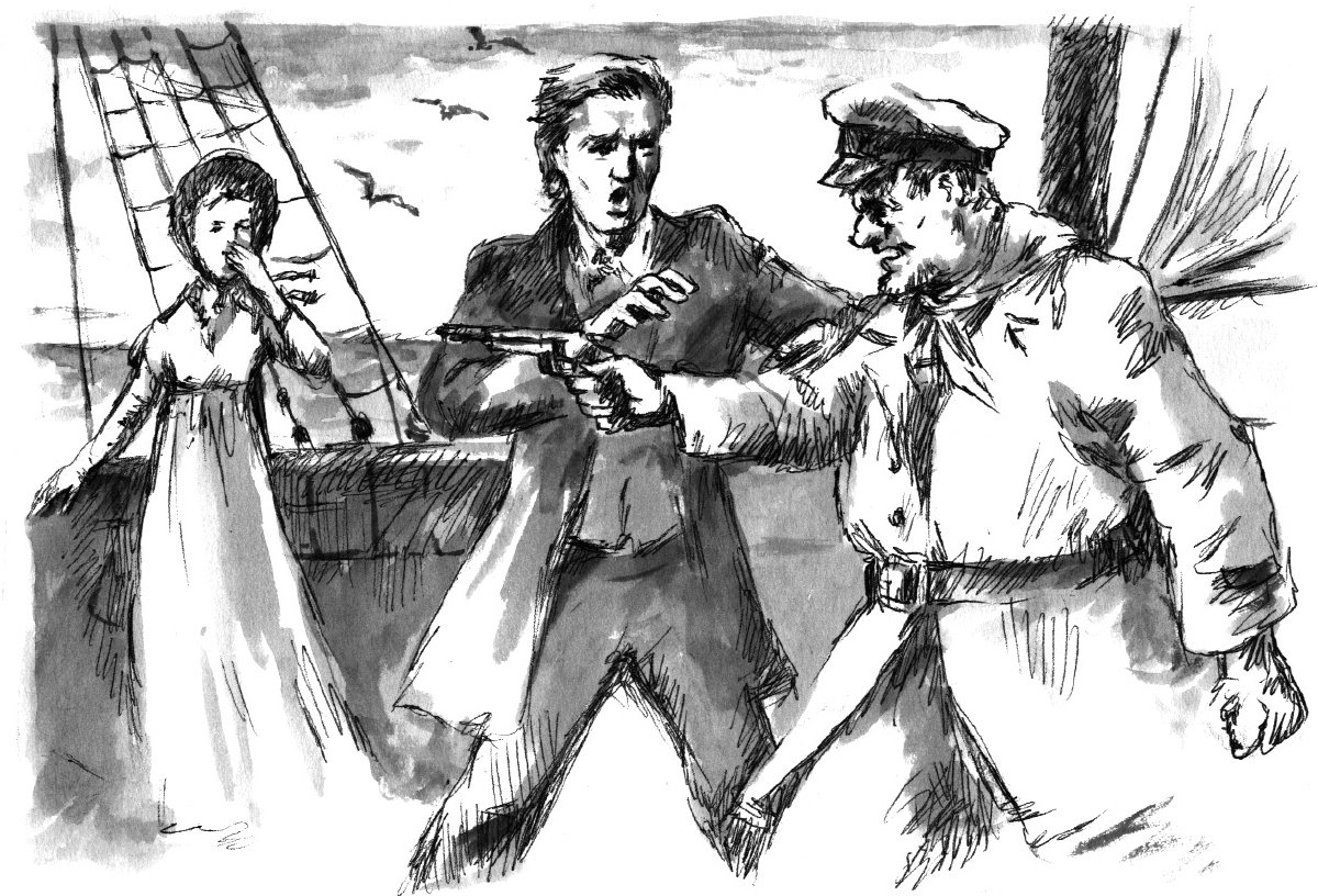Onlar gəminin göyərtəsində kapitan Billinqlə söhbət edirdilər. İki matros diz çöküb göyərtəni yuyur, yavaş-yavaş onlara yaxınlaşırdı. Söhbəti bitirib getmək üçün geri addım atan kapitanın ayağı matroslardan birinə ilişdi və o, müvazinətini saxlaya bilməyib yerə yıxıldı. Yıxılanda ayağı vedrəyə dəydi, çirkli su üstünə töküldü. Nazirlik işçisinin və gözəl xanımın qarşısında özünü alçaldılmış hiss edən Billinq pərtlikdən qıpqırmızı qızardı, sıçrayıb var qüvvəsi ilə matroslardan birinin çənəsinə yumruq ilişdirdi. Arıq, balacaboy, çalsaç matros yerə sərildi. Onun enlikürək, yekəpər yoldaşı bunu görəndə dikəldi, dişlərini it kimi qıcadı, altdan-yuxarı güclü zərbə ilə kapitanı ikinci dəfə döşəməyə uzatdı.