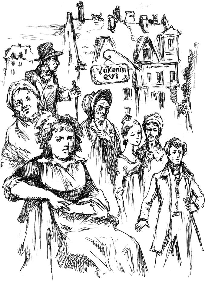 Qayıdaq madam Vokenin evinə… Hər mərtəbənin xırda çərçivəli beş pəncərəsi var. Evin arxa tərəfindəki həyətin eni iyirmi futdur2. Burada donuzlar, ev dovşanları və toyuqlar bir-birinə qarışıb. Həyətin bir küncündə odun anbarı gözə dəyir. Anbarla mətbəx pəncərəsi arasında ərzaq üçün qutu sallanır. Qutunun altından mətbəxin çirkab suyu axır. Həyətdən küçəyə tərəf balaca bir qapı açılıb. Qaravaş evin zir-zibilini həmişə burdan çölə atır.