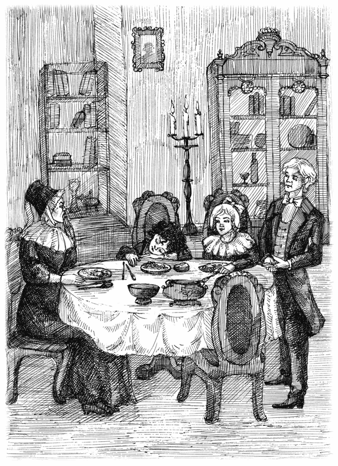 Sebastyanla Tinetta şam yeməyi üçün süfrə açmışdılar. Nökər Klaranın arabasını itələyərək yemək otağına gətirdi və qızı arabadan qaldırıb masanın ətrafındakı stullardan birinə oturtdu. Frau Rottenmayer də Klaranın yanındakı stulda əyləşdi, Haydiyə isə işarə ilə başa saldı ki, üzbəüzdəki kətildə otursun.