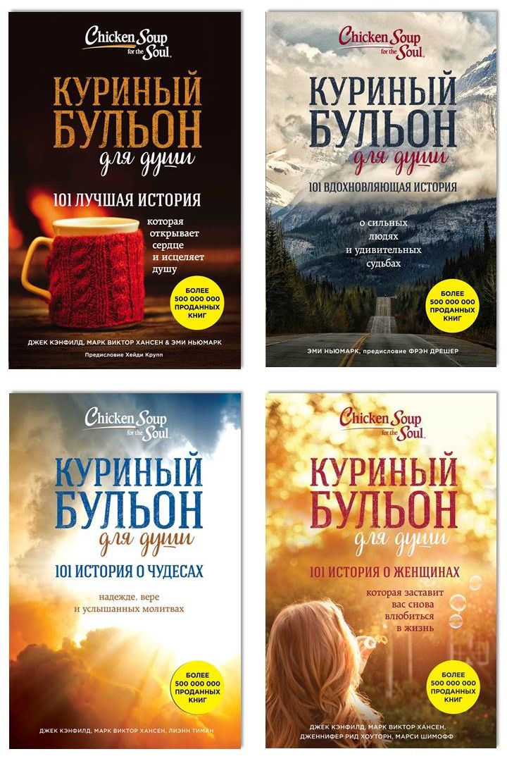 Позже Марси Шимофф[2] предложила нам составить книгу рассказов для женщин. Так появился «Куриный бульон для женской души». Затем моя сестра Кимберли Кирбергер задумала книгу рассказов для подростков – и родилась серия «Куриный бульон для подростковой души». Доктор Мартин Бекер, ветеринар, выдвинул идею собрать книгу рассказов для любителей животных. Вместе со своим партнером-писателем Кэрол Клайн он запустил еще одну линейку серии. Остальное, как говорится, уже достояние истории.