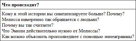 Я сняла трубку. Мелисса сразу перешла на повышенный тон, что типично для восьмого типа. Она изложила суть дела безо всяких предисловий (тоже характерная черта Восьмерок): «Опять эта Эмили! Мы только закончили шестимесячный отчет о проделанной ею работе. Я спросила, не хочет ли она обсудить что-то до того, как мы перейдем к оценке ее продуктивности. Мне это казалось отличной возможностью – своего рода фактором роста».