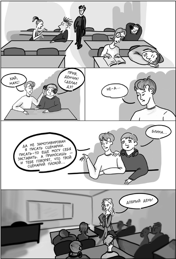 Здесь работает такой ЗАКОН: если ВАС ЛИЧНО ЦЕПЛЯЕТ тема, история, персонажи, это, скорее всего, ЗАЦЕПИТ И ЗРИТЕЛЯ. Если нет – текст будет мертвым, будь в нем хоть тысяча страниц. То есть просто так, по-бытовому, на «отвяжись», написать сценарий не получится. Мертвый текст равен самому себе и мало кому интересен.