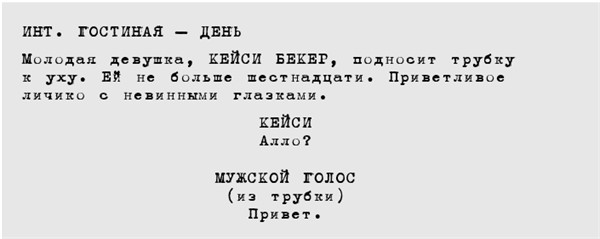 Это пример текстового отрывка из ЛИТЕРАТУРНОГО СЦЕНАРИЯ. Как видите, литературный сценарий – это подробнейшее описание будущего фильма. В нем последовательно описывается, что каждый персонаж делает (ДЕЙСТВИЯ), говорит (РЕПЛИКИ), как он говорит (РЕМАРКИ), где (ЛОКАЦИЯ) и когда (ВРЕМЯ) это происходит.