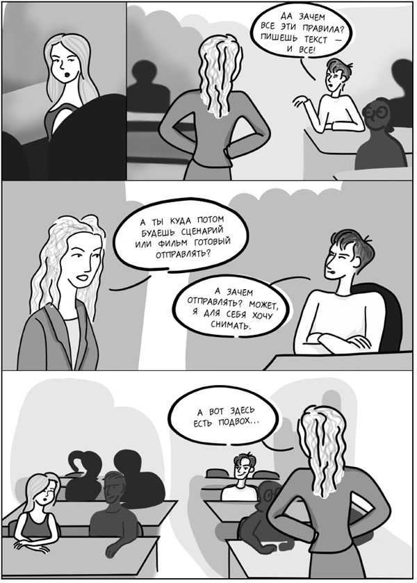 Все эти рассуждения могут показаться вам чересчур сложными, рациональными и ограничивающими творческое вдохновение. Однако речь здесь идет о ПРАВИЛАХ, существующих в кинематографическом и телевизионном профессиональном сообществе. Они жесткие, но они работают.