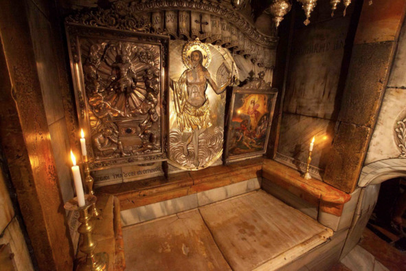 Войдя в Кувуклию, я оказался в приделе Ангела. Здесь находится камень, на котором, по преданию, сидел Ангел, сообщивший о Воскресении Христовом. Пройдя дальше сквозь низкий проход в стене, я попал в небольшое помещение, возведенное над ложем, на котором три дня – от Погребения до Воскресения – лежало Тело Иисуса Христа.