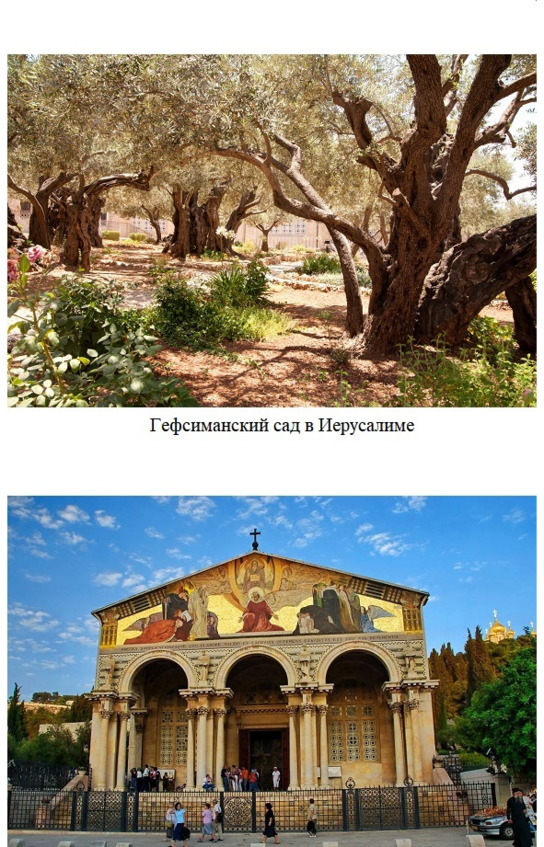 В Иерусалиме находится ряд объектов культа, имеющих огромное значение для Православной церкви. Прежде всего, это Гефсиманский сад, явившийся свидетелем душевных мук Иисуса Христа. В Гефсиманском саду растут восемь старых оливковых деревьев, посаженных еще во времена Иисуса. Здесь же расположена базилика Страстей Господних, внутри которой находится скала (камень) Страстей Господних. Обычно паломники простираются ниц перед этой святыней, молятся и вспоминают страсти Господа перед тем, как его схватили римские стражники.