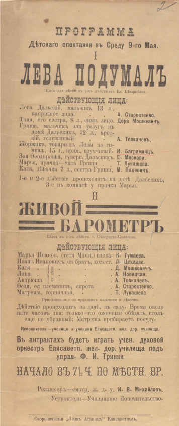 Афиша спектакля «Лева Подумал», поставленного попечительством Елизаветпольского училища в 1912 г. Из фонда И. Х. Багранмяна Национального Архива Армении. Обратите внимание на дату.