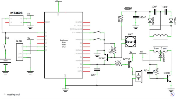 У одного из протестированных библиотек можно было наблюдать заторможенность в работе, у прочих невнятные показатели на малом дисплее и т.д., в результате такой выборки был определён результирующий тип библиотеки GyverOLED и GyverButton, работающие на частоте 80 кГц. Когда схема была собрана были произведены экспериментальные запуски, однако, они показали, что повышающий модуль привёл к быстрому перегоранию большого количества деталей, в том числе и самой платы Arduino, из-за чего пришлось его заменить на автогенератор со стабильным напряжением с дросселем и двумя обмотками – поверхностной на 3 витка и понижающий на 5 витков. Также для заземления применён транзистор МПМ типа 13003 или КТ815.