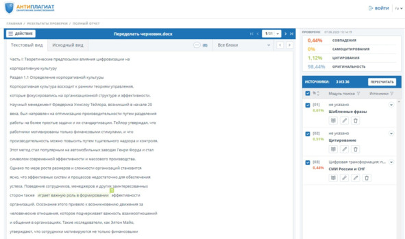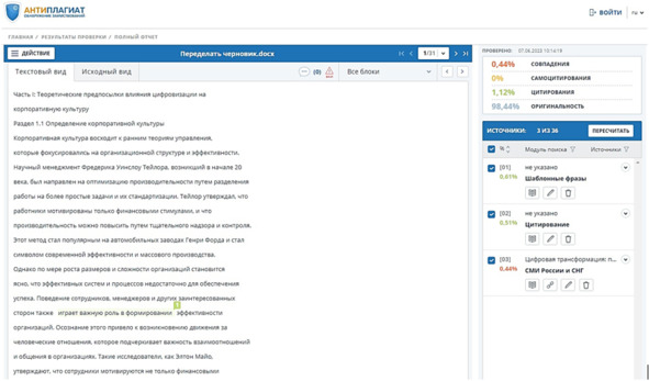 Рисунок 18 – Отчет Антиплагиат от 07.06.2023 – 10:14:19, спустя 1 час