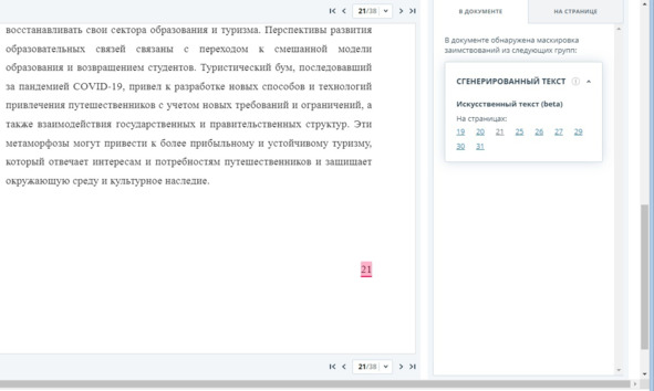 Рисунок 21 – Нумерация страниц отнесена Антиплагиатом к генеративному тексту ИИ