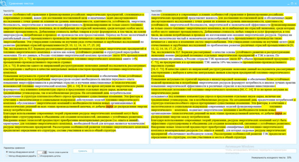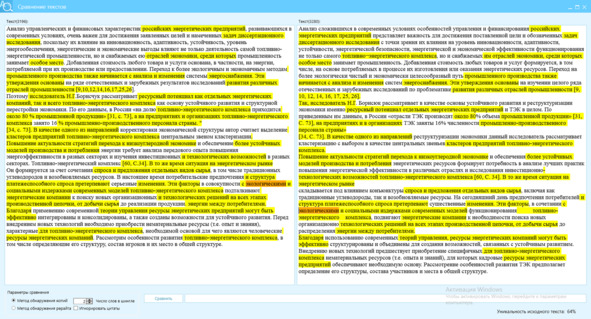 Рисунок 32 – Сверка текста источника (правое окно) с перефразированным текстом (левое окно) по методу шинглов, состоящим их 2 слов (Ш2), отличие текстов 64%