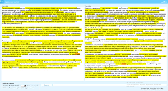 На рисунке 29 представлена сверка текста по методу Ш2, как видно тексты отличаются на 40%.