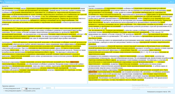 Рисунок 31 – Сверка текста источника (правое окно) с перефразированным текстом (левое окно) по методу шинглов, состоящим их 2 слов (Ш2), отличие текстов 55%