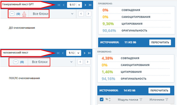 Рисунок 4 – Генеративный текст, созданный с помощью GPT, «ДО» и «ПОСЛЕ» очеловечивания КонтрПлагиат