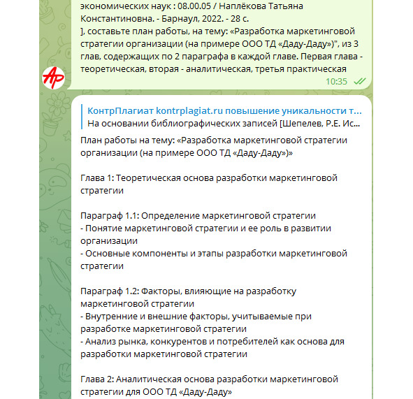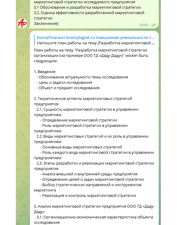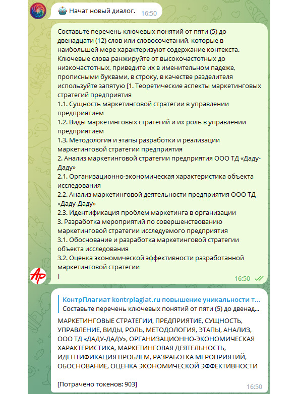 Мы не случайно рассмотрели основные требования к введению, т.к. все эти рекомендации могут нами использоваться при составлении промптов для GPT. Допустим имеется тема: «Разработка маркетинговой стратегии организации (на примере ООО ТД „Даду-Даду“)», рассмотрим работу с GPT на примерах.
