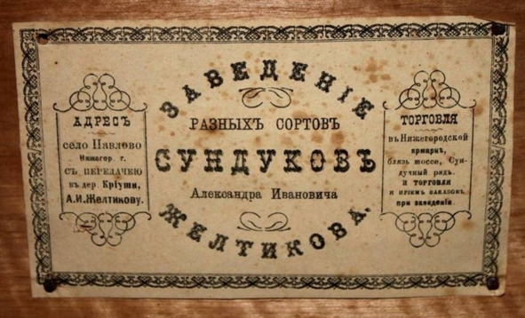 Литература: Пудов Г. А. Материалы о сундучном заведении А. И. Желтикова (Владимирская губерния, Муромский уезд, 2-я половина XIX в. – 1-я половина XX в.) // Наше Ополье. Краеведческий сборник. – 2019. – №1 (25). – С. 39—47.