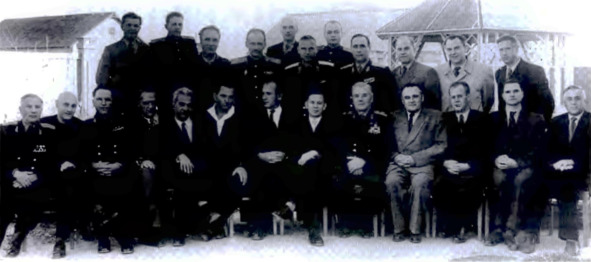 Рис 1.3. Государственная комиссия, руководившая подготовкой пусков 1-го и 2-го искусственных спутников Земли. 3 ноября 1957 г., НИИП-5. Сидят: 6-й справа председатель Государственной комиссии Василий Рябиков, 5-й справа заместитель председателя Государственной комиссии Митрофан Неделин, 4-й справа технический руководитель всего проекта Сергей Королев.