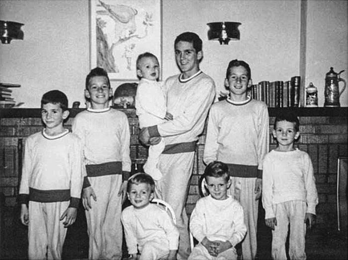 В 1961 году, спустя считаные месяцы после рождения Питера, Мими забеременела в одиннадцатый раз. Под Рождество, незадолго до родов, она, Дон и их десять сыновей сфотографировались на парадной лестнице Арнольд-холла, главного зала приемов Академии. Мальчики были в одинаковых школьных костюмах, которые купила мать Мими в универмаге Lord&Taylor[23]. Дедушка Мими Линдси назвал полученную по почте фотографию «поразительной» – многочисленные дети, и конца и краю не видать. Он предсказал Мими двойню – таким образом детишек станет ровно дюжина.