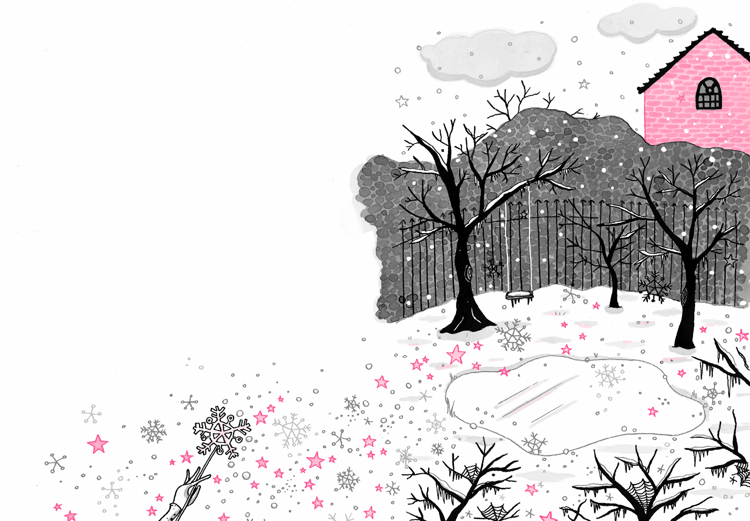 …полетели искрящиеся снежинки, а в центре нашего сада появилось большое блестящее зеркало, сверкающее на солнце, – каток! Правда, в окружении зелёной травы всё это выглядело довольно странно. Вероятно, Хрусталинка подумала то же самое, потому что снова взмахнула волшебной палочкой, и сад превратился в настоящую зимнюю сказку! Иней мерцал на ветках деревьев, а землю устилал толстый снежный ковёр. Даже воздух стал другим – морозным, а кругом всё словно притихло и замерло.