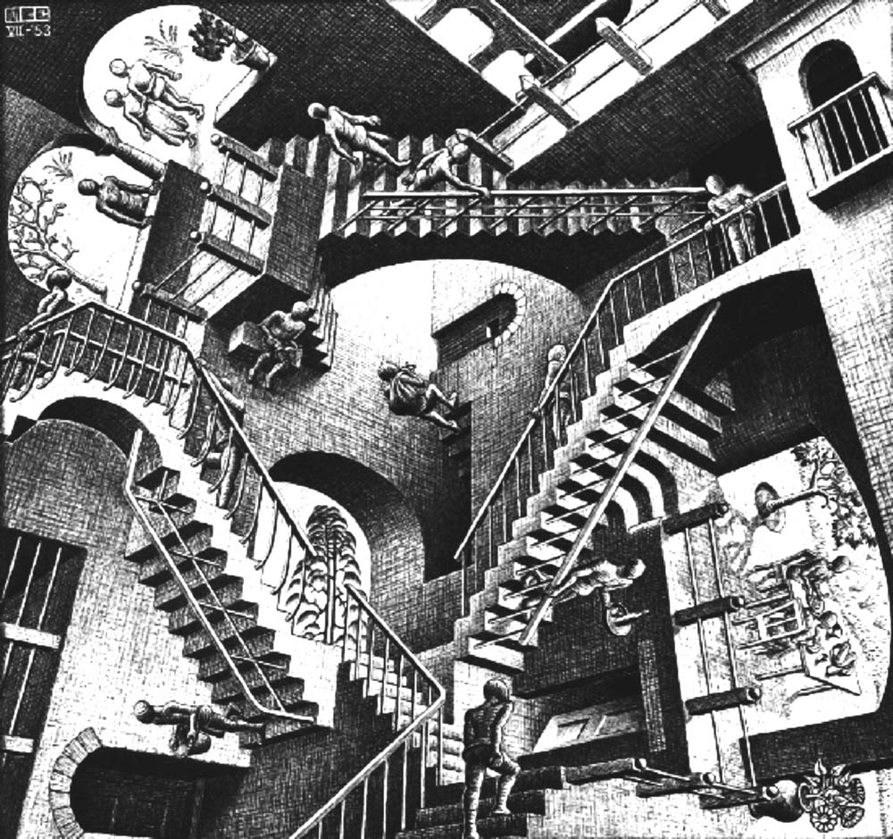 Elbette tüm metakurmacalar gibi paradoksal olasılıklar taşır. Ancak, Searle’ün bu resmi tartıştığı makalesinde15 söz ettiği gibi, Escher’vari bir imkânsızlık değildir burada söz konusu olan. Borges’in de pek sevdiği labirentlerden, birbirine bağlanan gerçekte olamayacak merdivenlerden bolca çizmiştir Escher. Ama Nedimeler’le karşılaştırıldığında onları açıklamak çok daha kolaydır. Birden fazla referans noktasının aynı resmin içine yerleştirilmesinden ibarettir Escher’in yaptığı. Birden fazla zeminin olduğu bir uzayda merdivenler birbirinin içine geçerler ve biz perspektifin yarattığı yanılsamayla şaşırırız. Sonra da şaşkınlığımızın nedenini kolayca anlarız: İkiboyutlu düzlemde üçboyutlu dünyayı resmedebilen çizim teknikleri pekâlâ üçboyutlu dünyada gerçekleşmesi imkânsız durumların yaratılmasında da kullanılabilir. Nasıl ki, perspektif tekniğiyle çizilmiş resim bir üçboyutlu dünya yanılsamasından başka bir şey değilse, imkânsız durumlar da aynı yanılsamanın farklı ürünleridir. Bu imkânsız durumlar yanılsamasını yazılı kurmaca yoluyla da yapmak mümkündür tabii. Bazen de bu tarz paradoksal yanılsamalar bir sonsuzluk döngüsünün içine sokabilir okuru.
