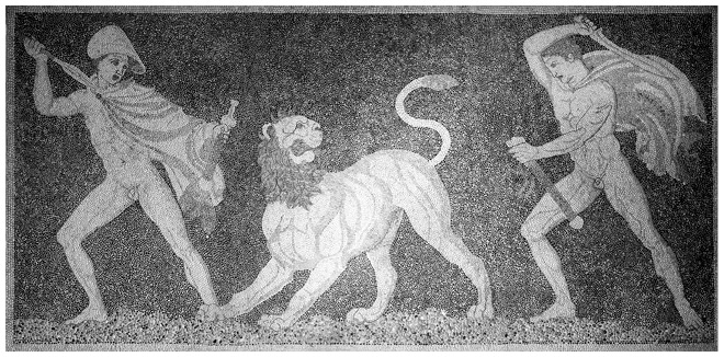 Крупный прорыв случился в начале 1957 года, когда местная семья начала копать подвал для деревенского дома на территории Старой Пеллы, современного поселения, которое перекрывает древнее[15]. Жители наткнулись на ионическую колонну и вызвали археолога. Им оказался Фотиос Петсас, который уже исследовал затерянный город. Археолог быстро оценил значение находки и сумел раздобыть денег на небольшие пробные исследования. Выяснилось, что колонны находятся на изначальном месте, зато памятник выходит за пределы предполагаемого деревенского подвала. В последующие месяцы археологи медленно раскрывали план здания, и из пропеченной солнцем земли стали возникать дворы, проходы, вестибюли и банкетные залы. Это был монументальный эллинистический дом, один из самых больших когда-либо обнаруженных, занимавший целый городской квартал. Среди находок оказался потрясающий набор мозаик из речной гальки. На некоторых из них были изображены геометрические узоры, другие представляли собой иллюстрации мифологических сюжетов, в том числе Диониса верхом на леопарде. Эта мозаика дала зданию его современное название – Дом Диониса. Но выделялась среди прочих другая мозаика. Выложенные белой галькой и обведенные терракотовым узором фигуры двух мужчин представали в героической наготе, их тела словно светились на темном фоне, а волосы и губы были окрашены в оттенки оранжевого и красного. В развевающихся плащах и с поднятым оружием они противостояли мускулистому горному льву, помещенному в центр композиции в явной готовности к смертоносному прыжку. Позднее Петсас высказал предположение, что сцена изображает Александра и одного из его товарищей на царской охоте. Это не был мифический образ, это было событие из реальной жизни.