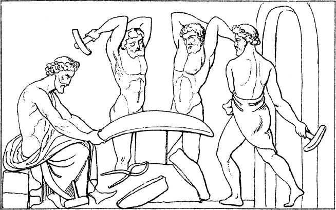 В этом же дворце находится и кузница Гефеста. Бо́льшую часть времени Гефест проводит в своей полной чудес кузнице. Посередине стоит громадная наковальня, в углу – горн с пылающим огнем и мехи. Дивные эти мехи – их не нужно приводить в движение руками, они повинуются слову Гефеста. Скажет он – и работают мехи, раздувая огонь в горне в ярко пышущее пламя. Покрытый потом, весь черный от пыли и копоти, работает бог-кузнец в своей кузнице. Какие дивные произведения выковывает в ней Гефест: несокрушимое оружие, украшения из золота и серебра, чаши и кубки, треножники, которые катятся сами на золотых колесах, как живые.