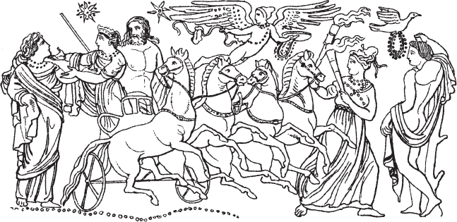 На четверке крылатых коней в золотой колеснице, которую выковал бог Гефест, выезжает на небо с берегов Океана лучезарный бог. Вершины гор озаряют лучи восходящего солнца, и они высятся, как бы залитые огнем. Звезды бегут с небосклона при виде бога солнца, одна за другой скрываются они в лоне темной ночи. Все выше поднимается колесница Гелиоса. В лучезарном венце и в длинной сверкающей одежде, едет он по небу и льет свои живительные лучи на землю, дает ей свет, тепло и жизнь.