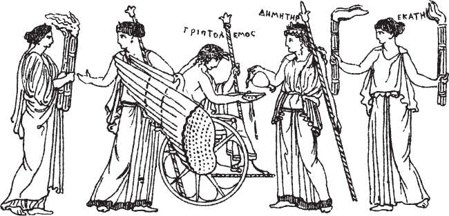 Триптолем. Великая богиня Деметра, дающая плодородие земле, сама научила людей, как возделывать хлебородные нивы. Она дала юному сыну царя Элевсина Триптолему семена пшеницы, и он первый трижды вспахал плугом поле у Элевсина и бросил в темную землю семена. Богатый урожай дало поле, благословленное самой Деметрой. На чудесной колеснице, запряженной крылатыми змеями, Триптолем по повелению Деметры облетел все страны и всюду научил людей земледелию.