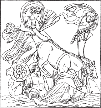 Медленно едет по небу в своей колеснице, запряженной черными конями, богиня Ночь-Нюкта. Своим темным покровом закрыла она землю. Тьма окутала все кругом. Вокруг колесницы богини Ночи толпятся звезды и льют на землю свой неверный, мерцающий свет – это юные сыновья богини зари Эос и Астрея. Много их, они усеяли все ночное темное небо. Вот как бы легкое зарево показалось на востоке. Разгорается оно все сильнее и сильнее. Это восходит на небо богиня Луна-Селена. Круторогие быки медленно везут ее колесницу по небу.