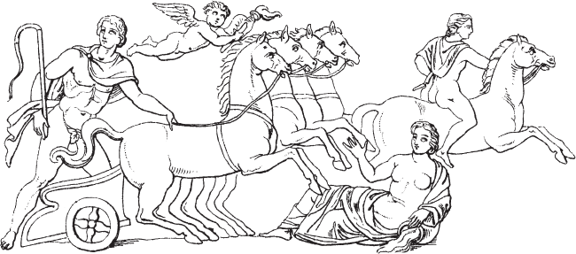 Похищение Персефоны Аидом[60]. Была у великой богини Деметры юная, прекрасная дочь Персефона. Отцом Персефоны был сам великий сын Крона, громовержец Зевс. Однажды прекрасная Персефона вместе со своими подругами, океанидами, беззаботно резвилась в цветущей Нисейской долине[61]. Подобно легкокрылой бабочке перебегала юная дочь Деметры от цветка к цветку. Она рвала пышные розы, душистые фиалки, белоснежные лилии и красные гиацинты. Беспечно резвилась Персефона, не ведая той судьбы, которую назначил ей отец ее Зевс. Не думала Персефона, что не скоро увидит она опять ясный свет солнца, не скоро будет любоваться цветами и вдыхать их сладкий аромат. Зевс отдал ее в жены мрачному своему брату Аиду, властителю царства теней умерших, и с ним должна была жить Персефона во мраке подземного царства, лишенная света и горячего южного солнца.