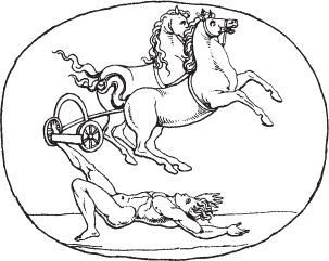 Зевс услышал мольбу богини Геи, грозно взмахнул он десницей, бросил свою сверкающую молнию и ее огнем потушил огонь. Зевс молнией разбил колесницу. Кони Гелиоса разбежались в разные стороны. По всему небу разбросаны осколки колесницы и упряжь коней Гелиоса.