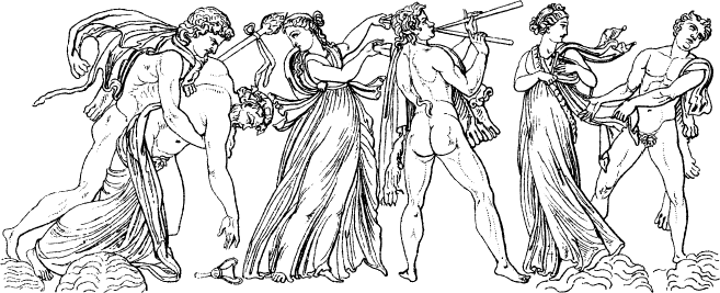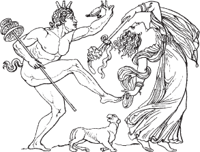 Дионис и его свита. С веселой толпой украшенных венками менад и сатиров ходит веселый бог Дионис по всему свету, из страны в страну. Он идет впереди в венке из винограда, с украшенным плющом тирсом в руках. Вокруг него в быстрой пляске кружатся с пением и криками молодые менады; скачут охмелевшие от вина неуклюжие сатиры с хвостами и козлиными ногами.
